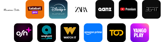 - 6 اشتراكات من بين 8خيارات. تشمل الخيارات:Disney+, Youtube Premium, WATCH IT , OSN+, Anghami Plus, Amazon Prime ,Yango Play and TOD