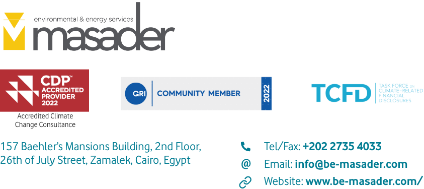 Masader is an innovative interdisciplinary consulting, design, and engineering sustainability firm based in Cairo, aiming at leveraging positive impact across the MENA region and globally. It specializes in Resource Efficiency, Sustainable Management of Natural Resources, and Integrated Sustainability Solutions. Since 2015, Masader has led 100+ projects across the areas of energy, environment, climate change & carbon footprint, circular economy, green building (LEED), as well as corporate sustainability strategies, reporting, and certification.